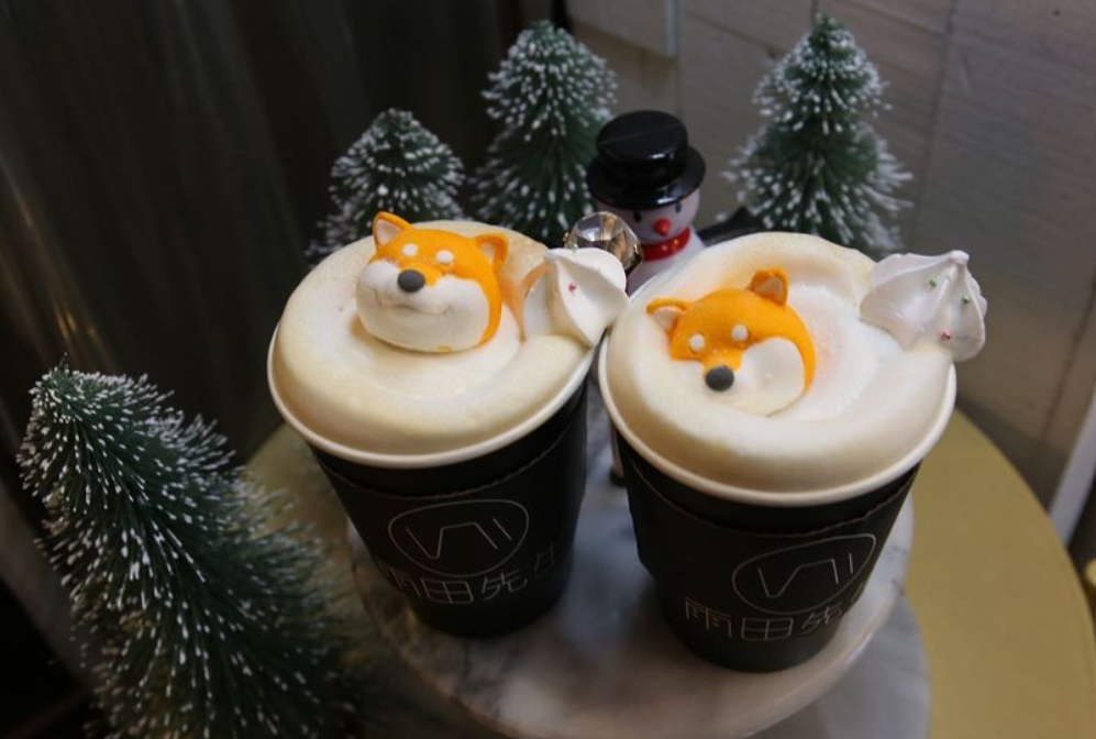 음료위에 시바이누 모양의 마시멜로우를 올려주는 테이크아웃 전문점